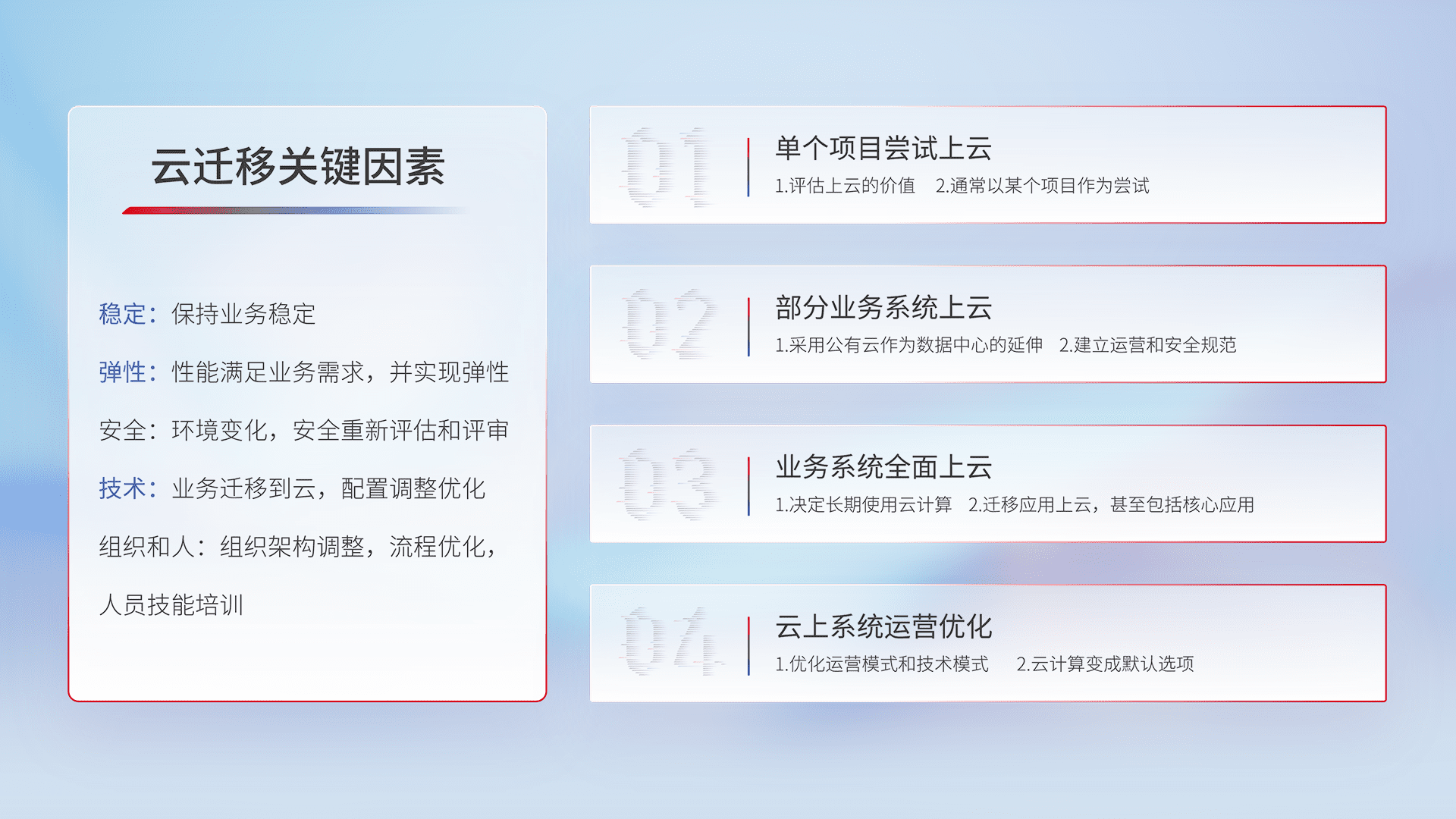 结合实际业务,,,从规划设计、、、、云平台选型、、、、云原生改造、、、、数据迁移、、、、集成交付,,迁移全过程为客户识别最佳上云路径,,,做好风险识别管理,,,设计网络架构、、身份权限、、、安全审计合规、、、、操作审计、、、、日志审计、、监控告警策略、、、多站点容灾设计等,,,对云上基础设施进行整体规划,,,,提升IT治理水平,,,以满足弹性、、、高可用、、、、高性能的需求。。