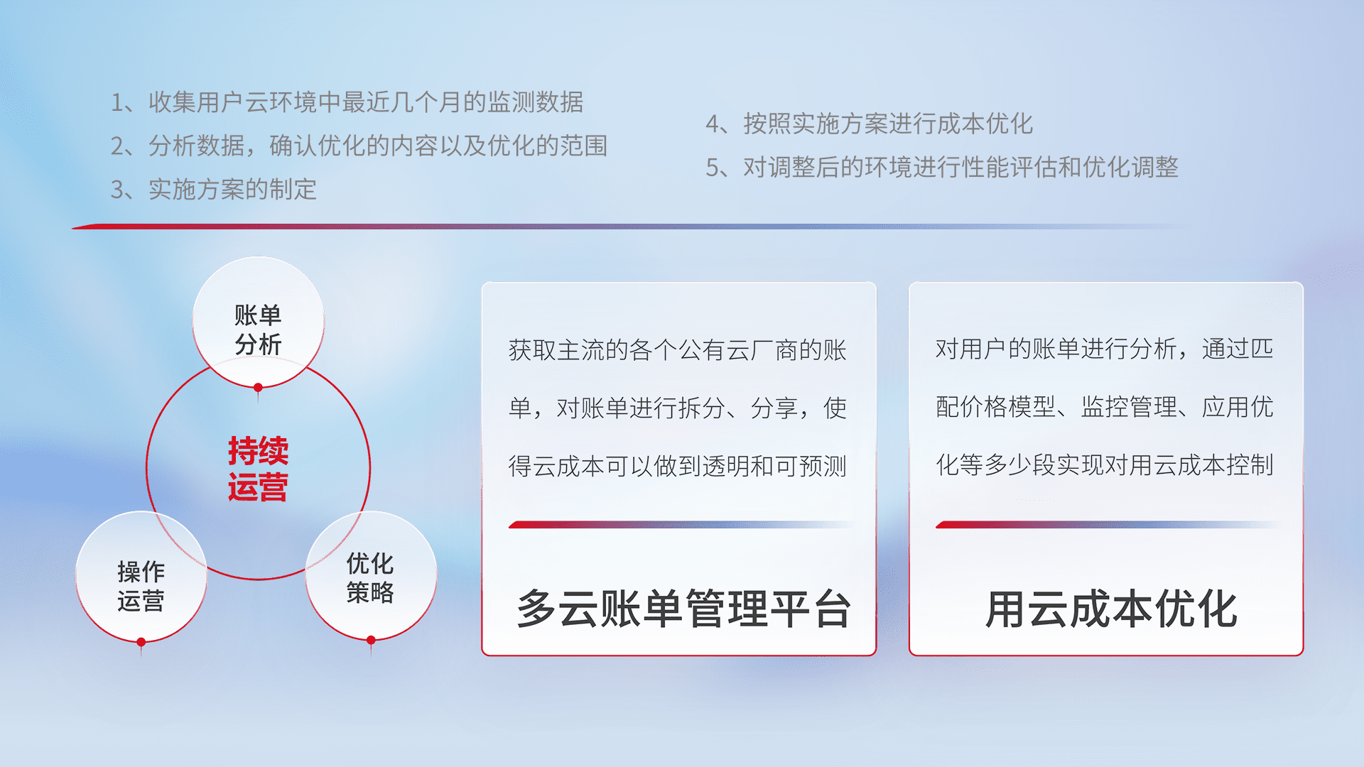 通过多云纳管,,,,以统一的资源数据模型把客户的云资源进行抽象和封装,,,进而实现对多云资源的统一操作,,,保障云资源管理的可靠性、、稳定性与可用性。。。量身定制化运维内容,,,配置、、、开发运维、、、、补丁管理、、、备份、、、、监控、、、认证和访问管理、、审计和日常巡检等,,,,保障在用云过程中的可靠度,,稳定度以及高可用率。。。。